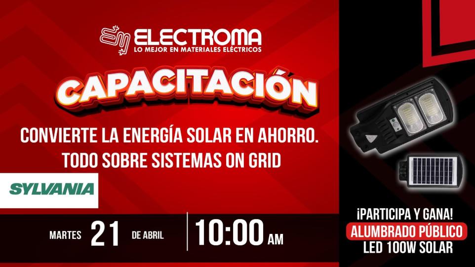 🔧 ¡Inscríbete ahora a nuestra capacitación virtual Convierte la energía solar en ahorro. Todo sobre sistemas On Grid, Este martes 21 de abril a las 10:00 a.m., aprende cómo mejorar tus proyectos eléctricos y participa en el sorteo de una lámpara para alumbrado público Led 100W Solar